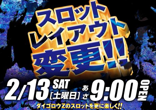 こんにちは🌞 ダイゴロウZ厚別店です('◇')ゞ 2月13日(土)は スロットコーナーレイアウト変更 となっております!! 開店時間は9時です!! 抽選時間は8時45分 となっております(*‘∀‘) ご来店お待ちしております!!